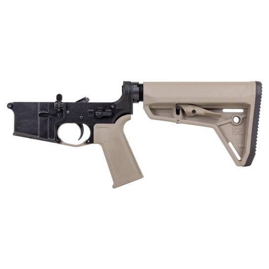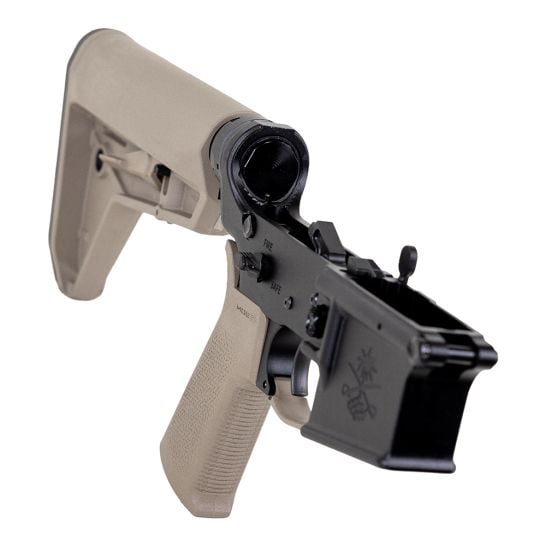 Palmetto State Armory complete Sabre-15 lower with FDE MOE SL stock and grip. Black finish. Marked multi-caliber. Comes Standard with Springco Buffer Spring, Battle Arms Development Pivot/Takedown Pins, PSA Sabre 2 Stage DLC Trigger Assembly and Anti-Walk Pins.